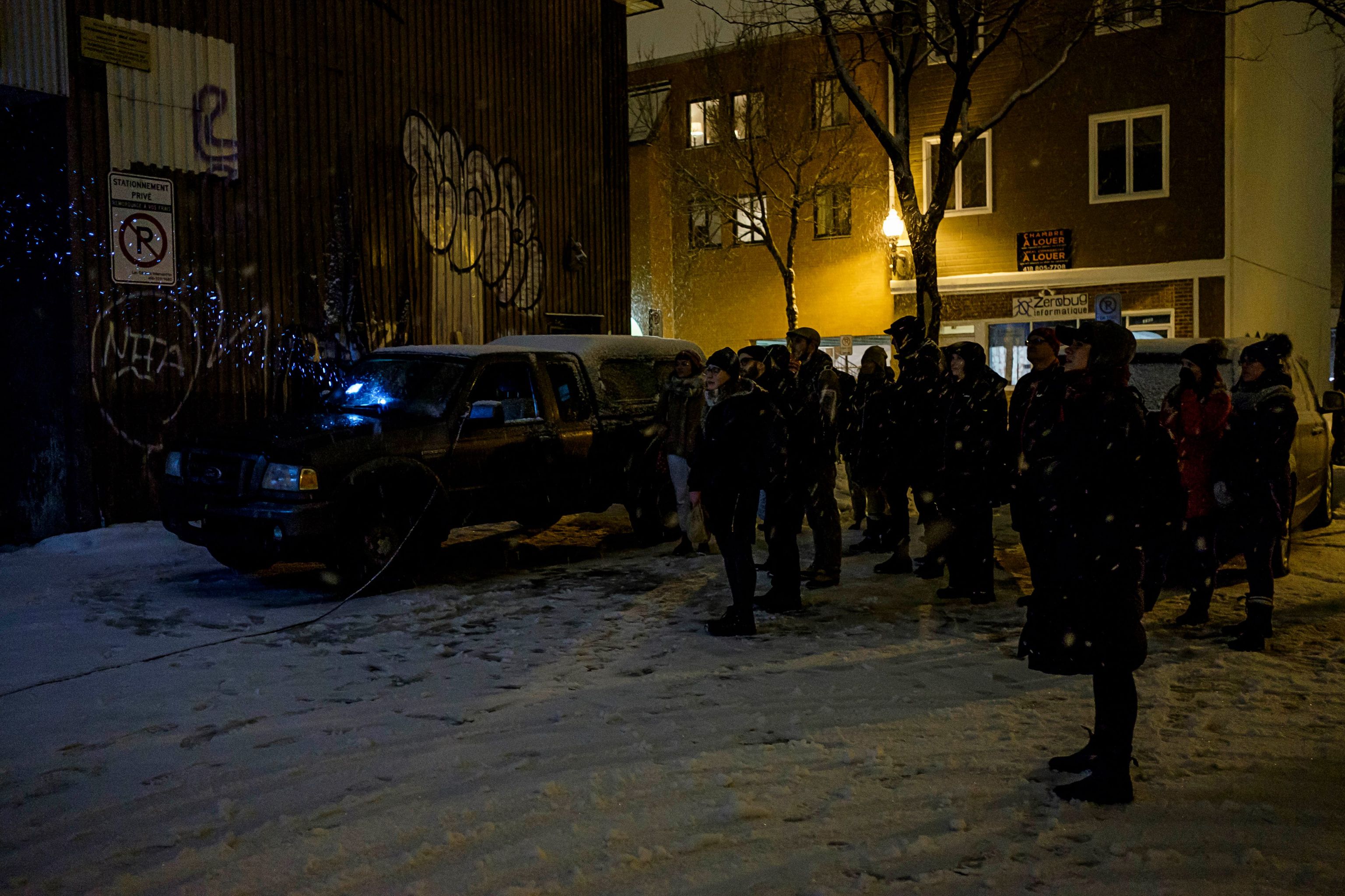 Diffusion de deux courts films présentés à partir d’un dispositif mobile permettant de projeter les vidéos sur différents murs de la ville de Québec. Projet en collaboration avec Vincent Labonté.